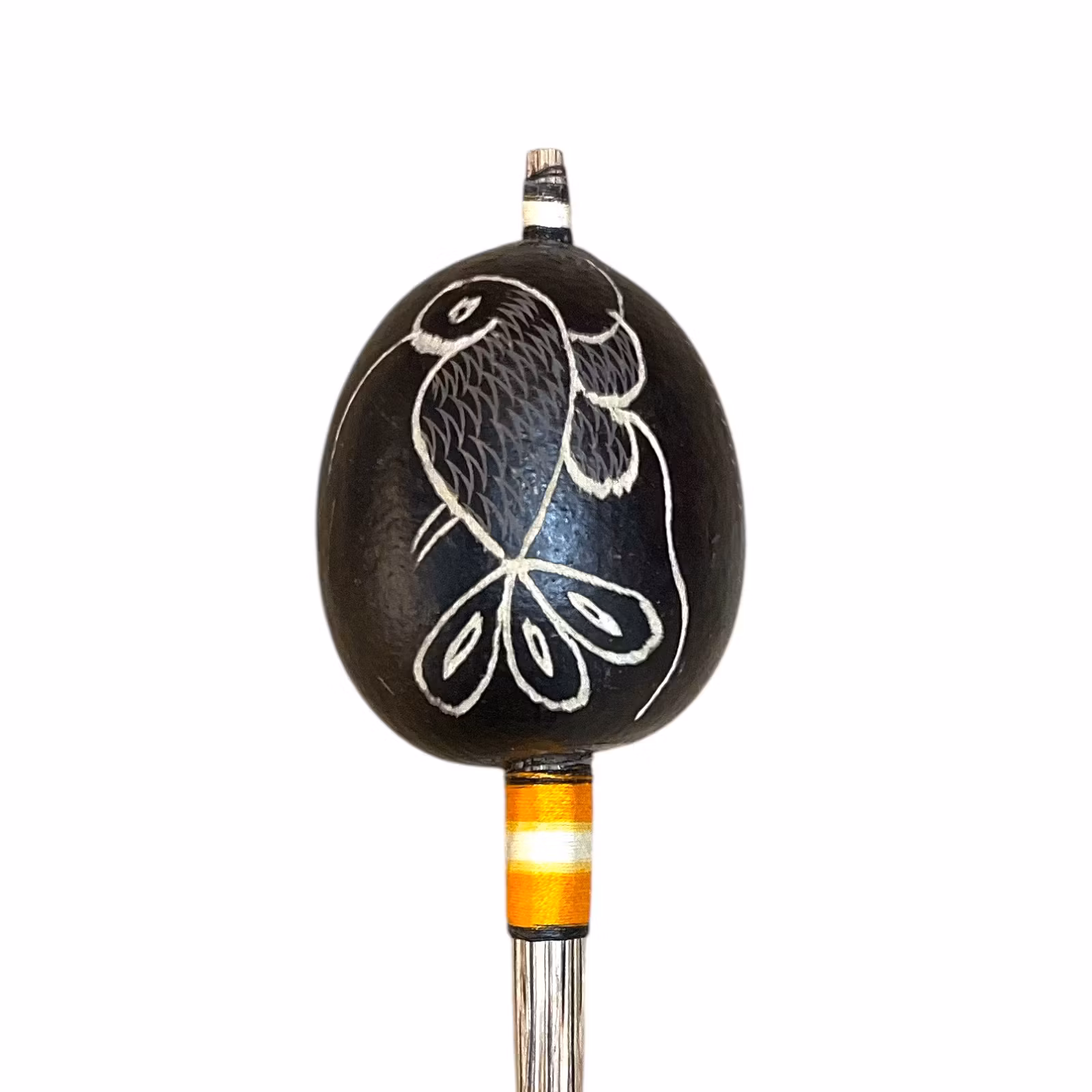 This magical rattle is more than just an instrument – it is a bridge to the spiritual realm, handcrafted in Peru by the ancient Shipibo people, whose profound wisdom is deeply intertwined with the energies of nature. Made from gourd and filled with seeds that dance within, it carries a unique and sacred sound that resonates with life. The handle, carved from the powerful chunta wood, embodies the stability and strength of the earth. Each rattle is unique, shaped by hands carrying generations of knowledge and love, making every piece a living work of art.