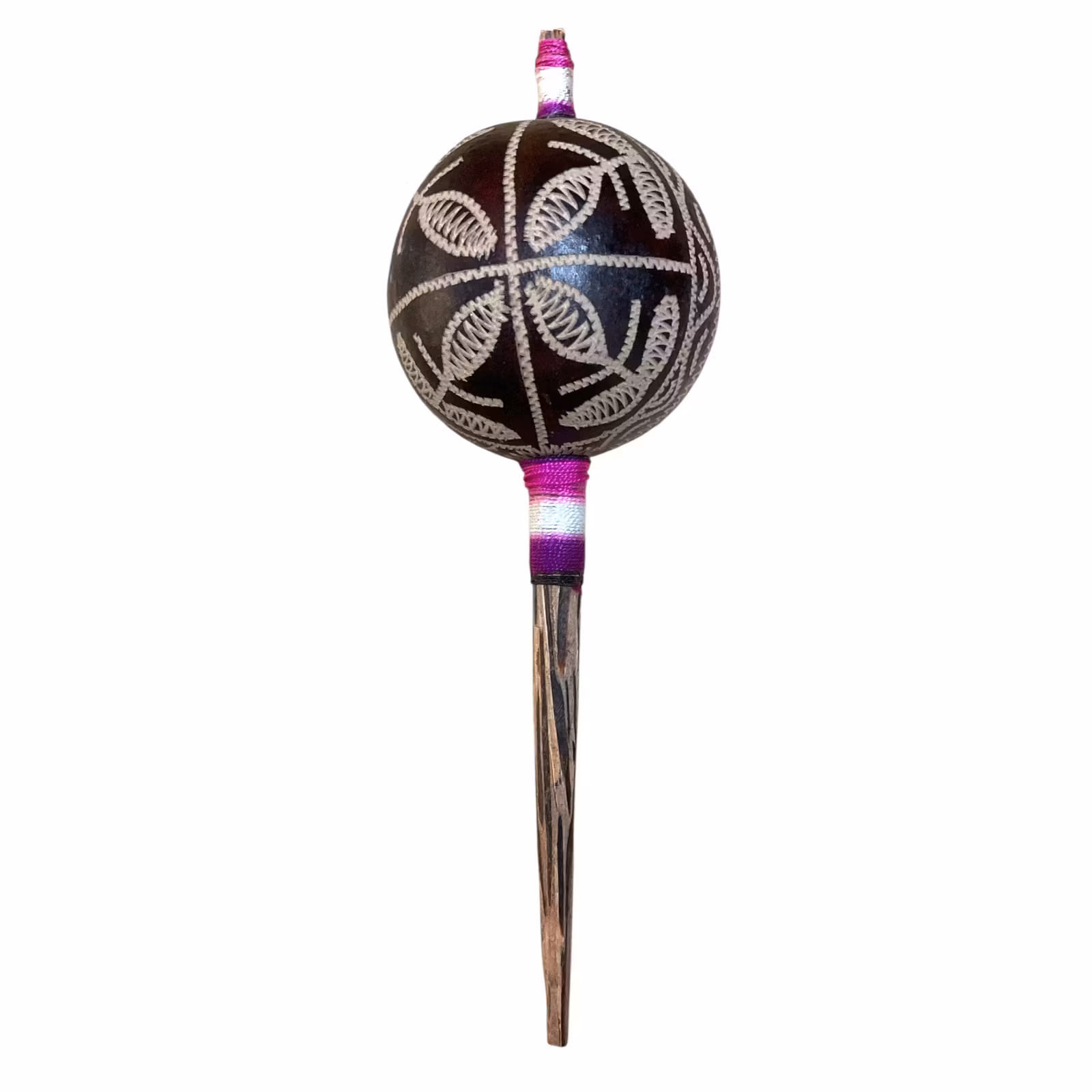 Från Perus heliga marker bär denna skallra med sig Andernas ande och Shipibo-folkets kraftfulla traditioner. I shamanens händer förvandlas den till ett verktyg för transformation, en förlängning av deras intentioner och visdom. Varje klang är en bön, varje vibration en påminnelse om att vi är sammankopplade med naturens oändliga flöde. Denna skallra är inte bara ett föremål – det är en levande kraft som bär på helande, inspiration och förbindelse med det gudomliga.