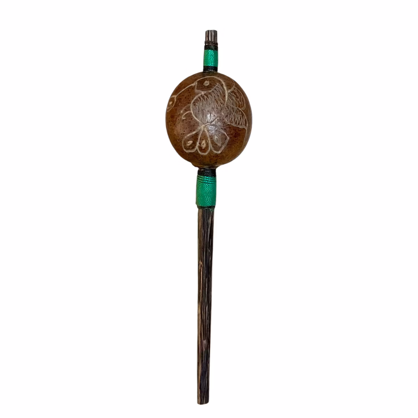 Från Perus heliga marker bär denna skallra med sig Andernas ande och Shipibo-folkets kraftfulla traditioner. I shamanens händer förvandlas den till ett verktyg för transformation, en förlängning av deras intentioner och visdom. Varje klang är en bön, varje vibration en påminnelse om att vi är sammankopplade med naturens oändliga flöde. Denna skallra är inte bara ett föremål – det är en levande kraft som bär på helande, inspiration och förbindelse med det gudomliga.