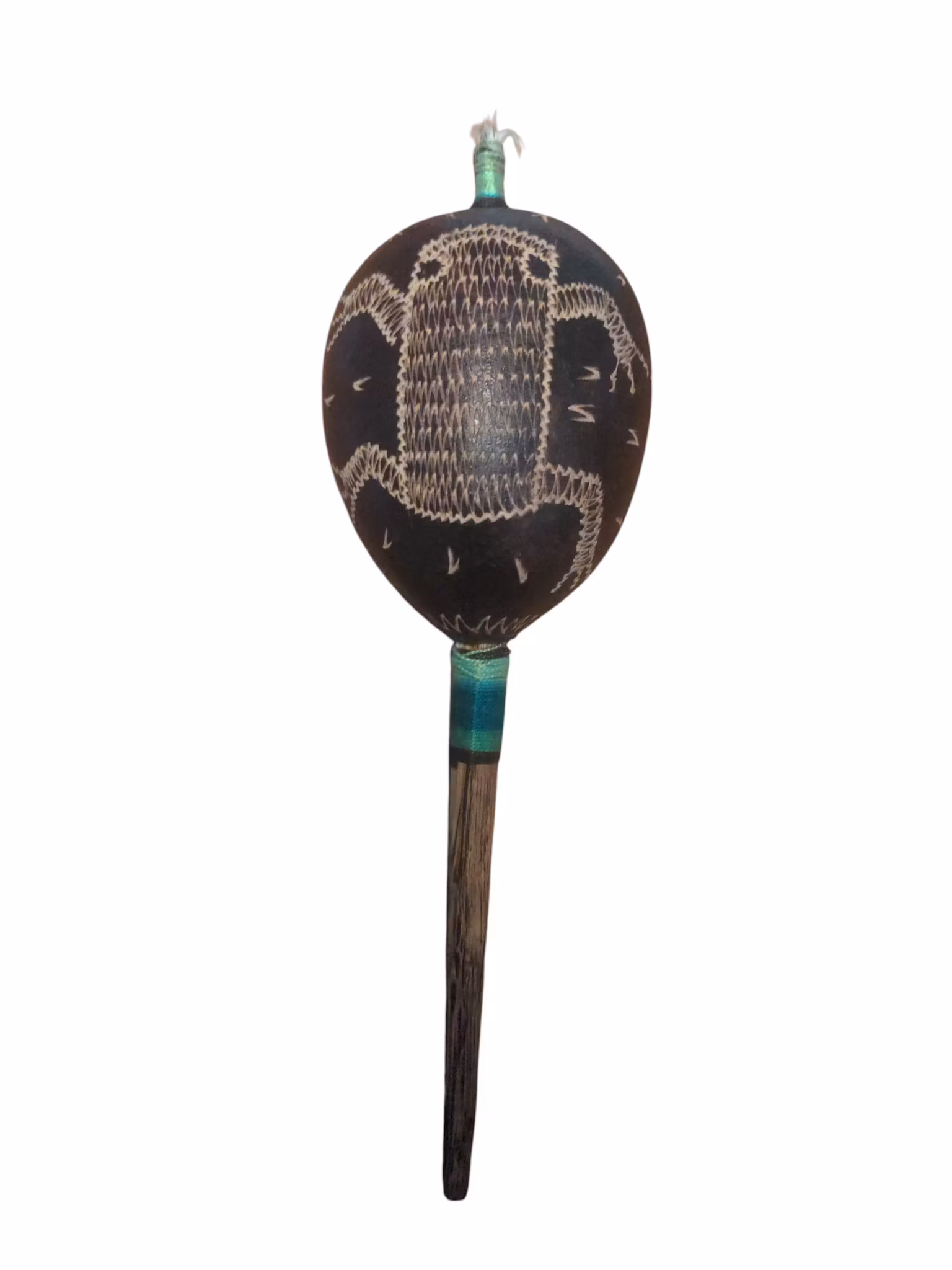 Från Perus heliga marker bär denna skallra med sig Andernas ande och Shipibo-folkets kraftfulla traditioner. I shamanens händer förvandlas den till ett verktyg för transformation, en förlängning av deras intentioner och visdom. Varje klang är en bön, varje vibration en påminnelse om att vi är sammankopplade med naturens oändliga flöde. Denna skallra är inte bara ett föremål – det är en levande kraft som bär på helande, inspiration och förbindelse med det gudomliga.